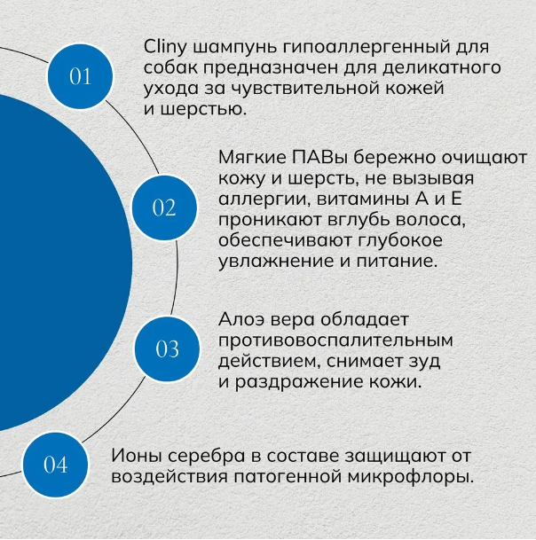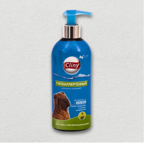 Cliny шампунь гипоаллергенный для собак предназначен для деликатного ухода за чувствительной кожей и шерстью.
