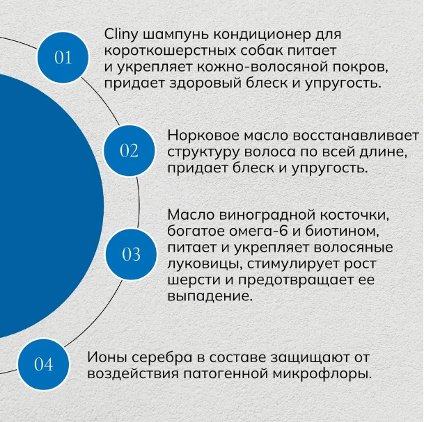 Cliny Шампунь-кондиционер для короткошерстных собак питает и укрепляет кожно-волосяной покров, придает здоровый блеск и упругость.