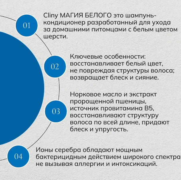 Cliny шампунь-кондиционер разработан для ухода за домашними питомцами с белым цветом шерсти. Подходит собакам, кошкам, кроликам.