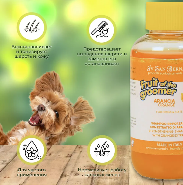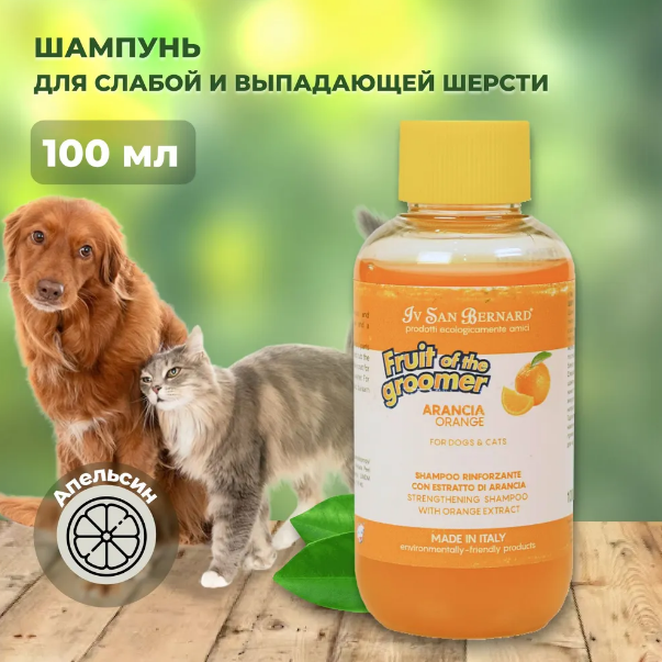 Шампунь Iv San Bernard Fruit of the Groomer Orange предназначен для регулярного применения, восстанавливает шерсть и кожу, нормализует сальные железы, предотвращает выпадение шерсти. Борется с последствиями стресса, тонизирует, добавляет блеск и шелковистость. Нанесите на влажную шерсть, массируйте, оставьте на 3 минуты, затем смойте. При необходимости повторите. Разбавьте водой для удобства применения (1:3). После использования обеспечивает комфортные ощущения., обладает приятным ароматом тальковой пудры и не раздражает глаза. Благодаря белкам меда устраняет патогенную микрофлору на коже. Наносится на влажную шерсть легкими массирующими движениями, выдерживается 3 минуты, затем смывается водой. После него рекомендуется использовать кондиционер Iv San Bernard Traditional Line Talc, который также подходит для ежедневной обработки лап и промывания морды. Оба продукта очень деликатны по составу, позволяя частое использование по сравнению с обычными моющими средствами.