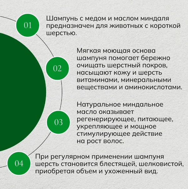 Pchelodar Шампунь с медом и маслом миндаля предназначен для животных с короткой шерстью. Мягкая моющая основа шампуня помогает бережно очищать шерстный покров, входящие в состав активные компоненты (пчелиный мед, масло сладкого миндаля и экстракты ромашки, череды и душицы) насыщают кожу и шерсть витаминами, минеральными веществами и аминокислотами, укрепляют волосяные луковицы, восстанавливают структуру волоса изнутри и усиливают естественный блеск. Натуральное миндальное масло оказывает регенерирующее, питающее, укрепляющее и мощное стимулирующее действие на рост волос. При регулярном применении шампуня шерсть становится блестящей, шелковистой, приобретая объем и ухоженный вид. Шампунь также препятствует проникновению грязи и отталкивает пыль от шерстного покрова животного. Шампунь не содержит SLS и агрессивных веществ. Натуральные компоненты профессиональных шампуней серии Energy of Nature позволяют применять их для животных с чувствительной кожей, склонной к аллергическим реакциям, а также щенкам и котятам.
