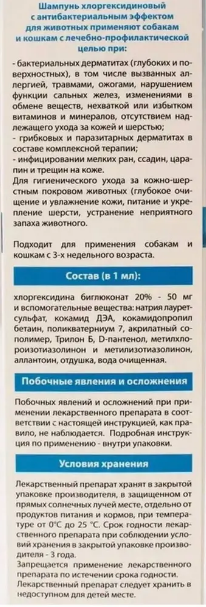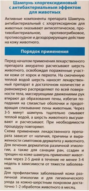 Шампунь хлоргексидиновый с антибактериальным эффектом для животных применяют собакам и кошкам с лечебно – профилактической целью при:-бактериальных дерматитах (глубоких и поверхностных), в том числе вызванных аллергией, травмами, ожогами, нарушением функции сальных желез, изменениями в обмене веществ, нехваткой или избытком витаминов и минералов, отсутствием надлежащего ухода за кожей и шерстью;-грибковых и паразитарных дерматитах в составе комплексной терапии; инфицировании мелких ран, ссадин, царапин и трещин на коже.- Для гигиенического ухода за кожно – шерстным покровом животных (глубокое очищение и увлажнение кожи, питание и укрепление шерсти, устранение неприятного запаха животного).Шампунь хлоргексидиновый с антибактериальным эффектом для животных содержит в 1 мл в качестве действующего вещества: хлоргексидина биглюконат 20 % - 50 мг, а в качестве вспомогательных веществ: натрия лауретсульфат, кокамид ДЭА, кокамидопропил бетаин, поликватерниум 7, акрилатный сополимер, Трилон Б, D-пантенол, метилхлороизотиазолинон и метилизотиазолинон, аллантоин, отдушку, воду очищенную.По внешнему виду препарат представляет собой однородную гелеобразную массу белого цвета.