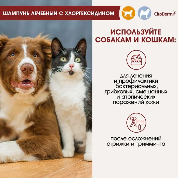 Citoderm шампунь лечебный с хлоргексидином применяют с лечебно-профилактической целью при бактериальных, грибковых, смешанных и атопических поражениях кожи, а также для профилактики осложнений после гигиенической стрижки и тримминга.
