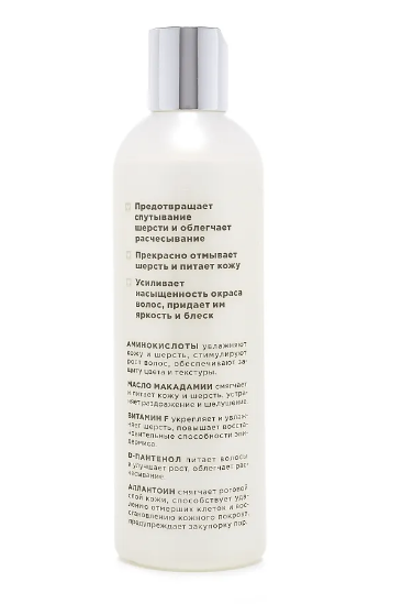 Шампунь на основе масла макадамии, комплекса аминокислот, провитамина В5 и витамина F. Масло ореха макадамии содержит не- заменимые жирные кислоты, витамин Е, витамин В, цинк, медь. Это превосходный компонент для восстановления, питания и смягчения шерсти и кожи. Витамин F обеспечивает здоровое состояние кожи и шерсти, увлажняет, предотвращает выпадение шерсти и появление перхоти, придает шерсти упругость, здоровый блеск и шелковистость. Провитамин В5 обладает противовоспалительным действием, ускоряет заживление мелких царапин и трещин, стимулирует рост, снижает ломкость, способствует восстановлению поврежденных участков шерсти, придает блеск.