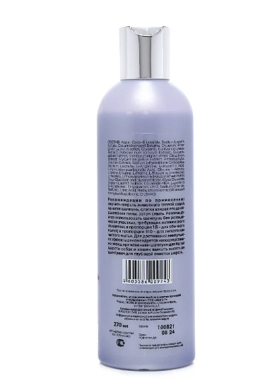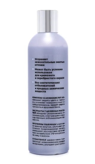 Шампунь содержит комплекс из 14 аминокислот, экстракты василька, петрушки, огурца, черной бузины, лимона, солодки, толокнянки, протеины пшеницы, D-пантенол. Предназначен для белой шерсти, но может использоваться для кремового, серебристого и даже черного окрасов. Устраняет нежелательные желтые оттенки. Отбеливающий эффект достигается за счет использования в рецептуре комплекса натуральных экстрактов. Не содержит синтетических отбеливателей и вредных химических веществ. Комплекс четырнадцати аминокислот увлажняет кожу и шерсть, стимулирует рост волос, обеспечивает защиту цвета и текстуры, устраняет поверхностные повреждения волоса, придаёт шерсти прочность и здоровый блеск
