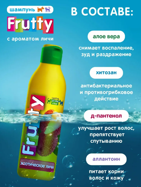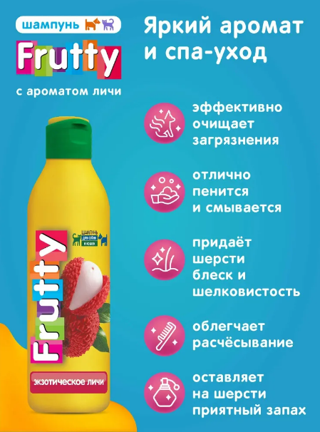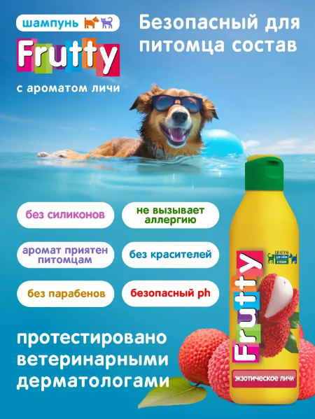 Шампунь Frutty (АВЗ) Экзотическое личи для собак и кошек – это высококачественный продукт, разработанный специально для ухода за шерстью и кожей домашних питомцев. Объем составляет 250 мл, что делает его экономичным и удобным в использовании.