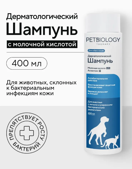 Шампунь с молочной кислотой и аллантоином - профессиональное средство для профилактики кожных заболеваний. Дерматологический шампунь с молочной кислотой и аллантоином предназначен для собак и кошек с 2-х месяцев, склонных к бактериальным инфекциям, воспалительным процессам и раздражению кожи. Молочная кислота способствует отшелушиванию рогового слоя эпидермиса, делая кожу гладкой и эластичной, а шерсть мягкой и шелковистой. Также защищает от изменений нормальной бактериальной флоры кожи и снижает уровень pH, препятствуя росту микробов. Аллантоин в составе увлажняет кожные покровы и восстанавливает поврежденную и ломкую шерсть. Шампунь помогает при легких и умеренных бактериальных проблемах кожи. Гипоаллергенная формула. Подходит для животных бесшерстных пород и для ежедневного ухода.
