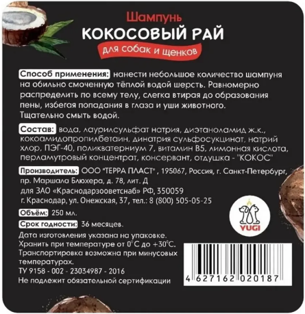 Шампунь YUGI Кокосовый Рай 250 мл д/соб и щен