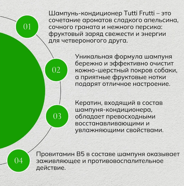 Наполните мир своего питомца ярким ароматом лета! Шампунь-кондиционер "TUTTI FRUTTI" – это сочетание ароматов сладкого апельсина, сочного граната и нежного персика: фруктовый заряд свежести и энергии для четвероногого друга. Уникальная формула шампуня бережно и эффективно очистит кожно-шерстный покров собаки, а приятные фруктовые нотки подарят отличное настроение.