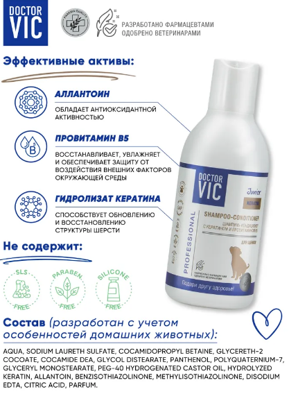 Серия DOCTOR VIC KERATIN JUNIOR разработана специально для деликатного ухода за шерстью и нежной и чувствительной кожей щенков. Шампунь-кондиционер придаёт шерсти мягкость, блеск и дополнительный объём, облегчает её расчёсывание и предотвращает спутывание. Ингредиенты в составе шампуня восстанавливают структуру шерсти, создают на поверхности кожи и шерсти защитное покрытие, обеспечивая надёжную защиту от неблагоприятных факторов окружающей среды.