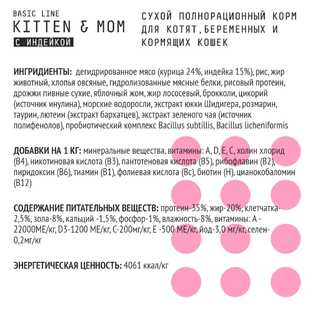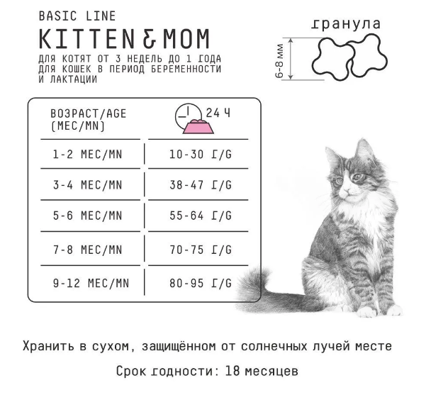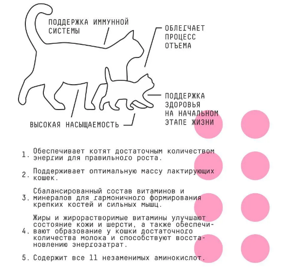 Содержит необходимое количество калорий, высококачественных белков, жиров и сбалансированный комплекс витаминов и минералов для правильного роста котят и поддержания оптимальной массы лактирующих кошек.