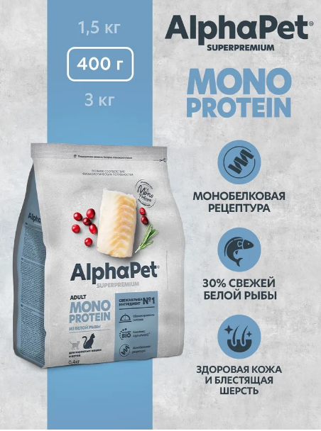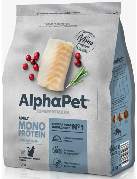 ALPHAPET MONOPROTEIN для взрослых кошек (БЕЛАЯ РЫБА), 0,4 кг