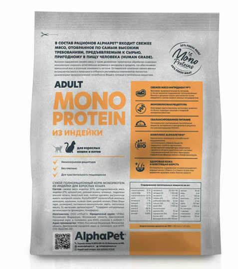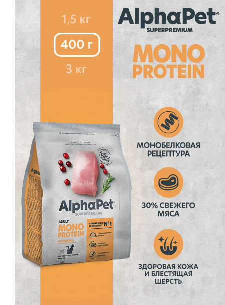 ALPHAPET MONOPROTEIN для взрослых кошек (ИНДЕЙКА), 0,4 кг
