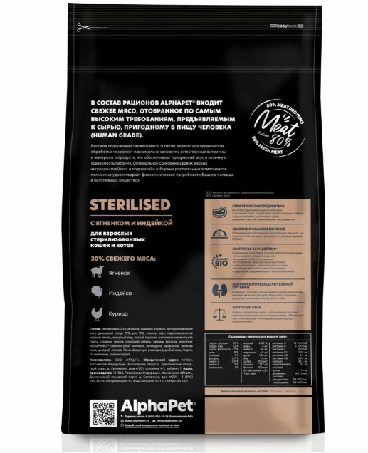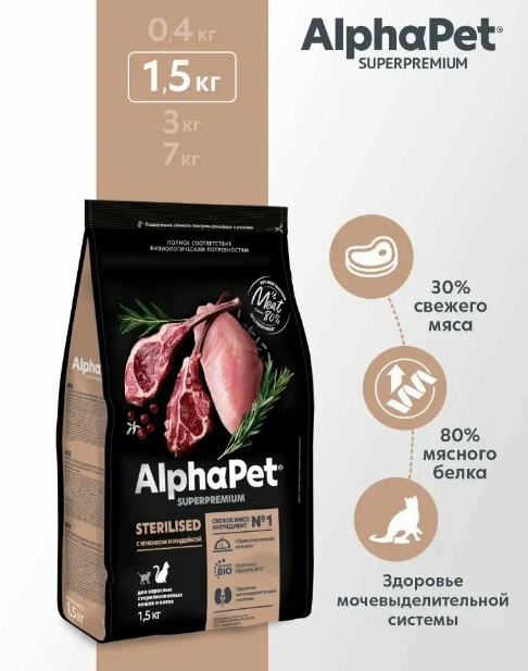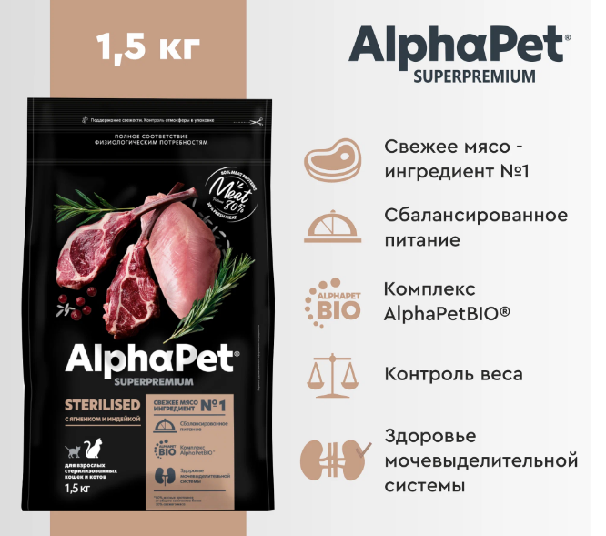 1,5 кг упаковка удобна и экономична в использовании. AlphaPet Superpremium - идеальный выбор для питания вашего стерилизованного друга, обеспечивая ему все необходимые питательные вещества для здоровой и счастливой жизни.