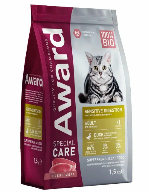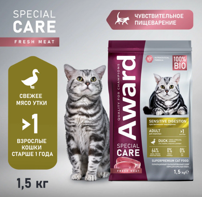 Award SPECIAL CARE для кошек с чувствительным пищеварением с уткой 1,5кг