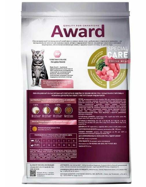 Корм Award - тщательно сбалансированная рецептура из 100% натуральных ингредиентов, созданная по инновационной формуле, обеспечивающей комплексную нутрицевтическую поддержку организма питомца.