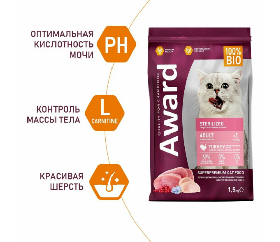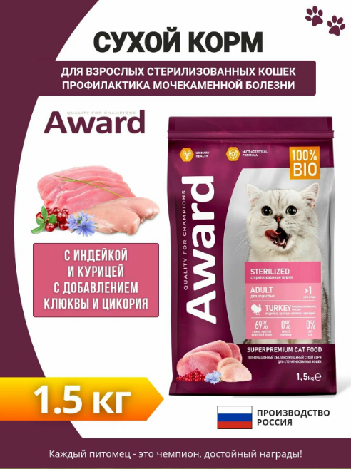 AWARD Sterilized для взр. стерил. кошек с инд. и кур. с доб. клюквы и цик. 1,5кг