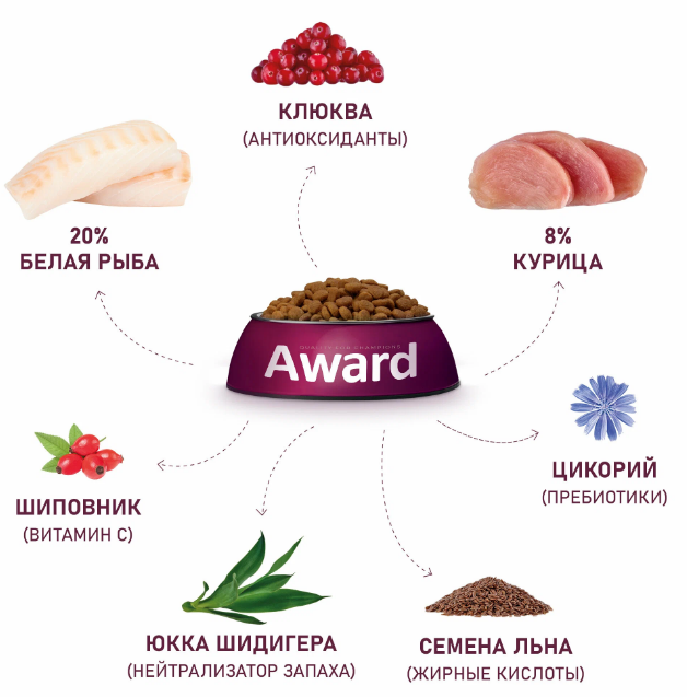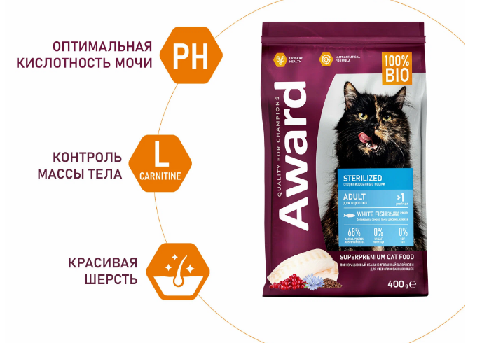 Сухой корм AWARD Sterilized для взрослых стерилизованных кошек с белой рыбой с добавлением семян льна, клюквы и цикория