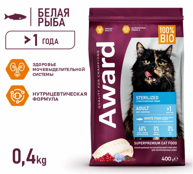 AWARD Sterilized для взрослых кошек с белой рыбой 400г