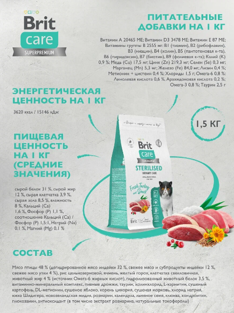 Brit Care Cat Sterilised Urinary Care для стерил.кошек с индейкой и уткой 1.5кг