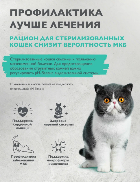 Полнорационный сухой корм суперпремиум-класса с индейкой и уткой для стерилизованных кошек. Профилактика МКБ. Здоровье мочевыводящих путей Поддержка сердечной мышцы Здоровье нервной системы Поддержка микрофлоры кишечника Стерилизованные кошки склонны к появлению мочекаменной болезни. Для предотвращения образования струвитных камней важно регулировать pH-баланс выделительной системы. Индейка естественный источник L-триптофана, гормона счастья DL-метионин поддерживает здоровье мочевыдели тельной системы Жирные кислоты из натуральных источников для красоты шерсти и здоровья кожи Свежее мясо для активности в течение дня Витамины, минералы и антиоксиданты для поддержки иммунитета питомца Растворимые и нерастворимые пищевые волокна для здорового пищеварения и микрофлоры кишечника.