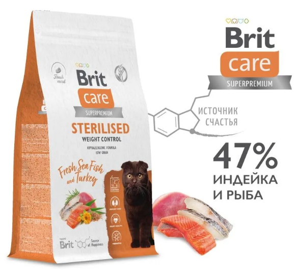Brit Care Superpremium Cat Sterilised Weight Control Turkey, Sea Fish / Брит Стерилайзд Контроль веса - сухой полнорационный корм суперпремиум-класса с морской рыбой и индейкой для стерилизованных кошек и кастрированных котов (контроль веса), упаковка 1,5 кг.