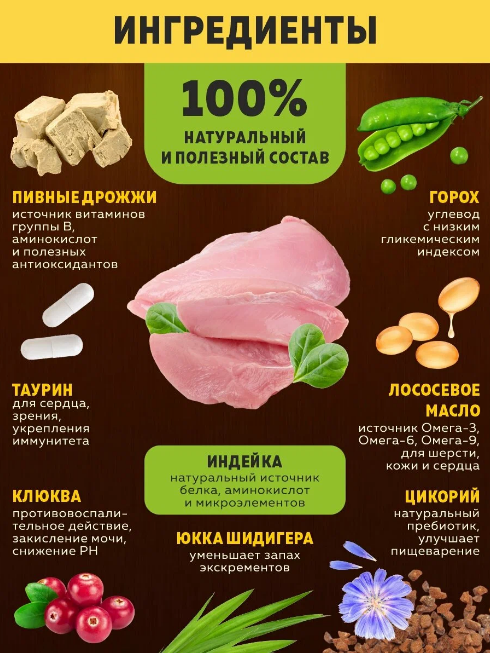 Он содержит свежее и дегидрированное мясо индейки - диетический и гипоаллергенный источник питательных веществ, витаминов А и Е, а также оптимальный баланс жирных кислот Omega-3 и Omega-6.