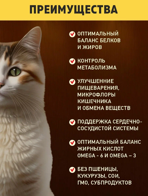 В кошачьем корме Бруксфилд НЕТ кукурузы, пшеницы, сои, ГМО и субпродуктов.