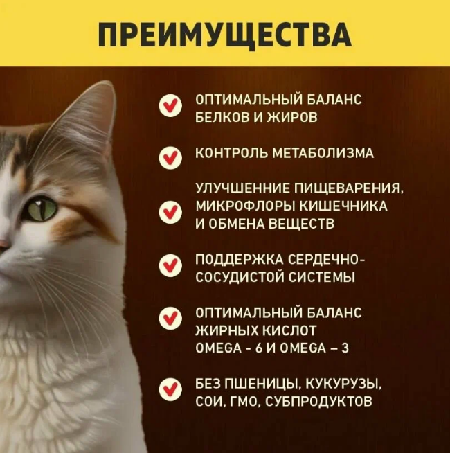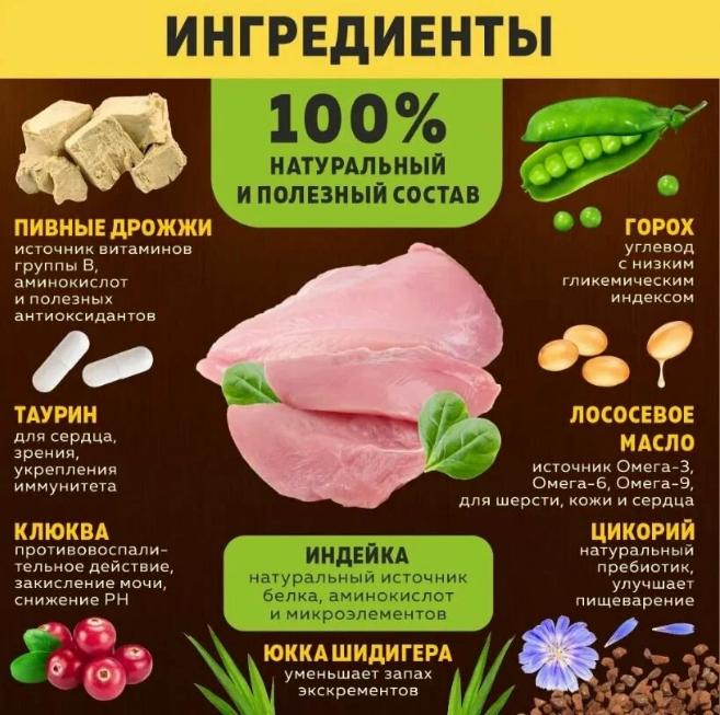 Не содержит пшеницу, кукурузу, сою, субпродукты, добавленные глютены, ГМО, искусственные красители, вредные химические добавки и консерванты. Натуральные ингредиенты и антиоксиданты. Оптимальный баланс жирных кислот Omega-6 и Omega-3.