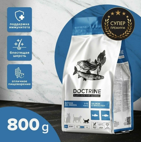 Безглютеновый суперпремиальный корм Doctrine для котят с лососем и белой рыбой. Правильное питание — это догма для растущего организма щенка.