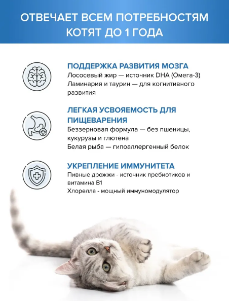 В рационе Doctrine для котят мы реализовали доктрину правильного питания. Лосось и тресковые породы рыб богаты белком, полезными жирами, витаминами, макро- и микроэлементами. Картофель, цельный горох, сахарная свекла и морковь отвечают за пищеварение котенка. А шпинат насыщает организм малыша железом и антиоксидантами. И, конечно, никакого глютена!