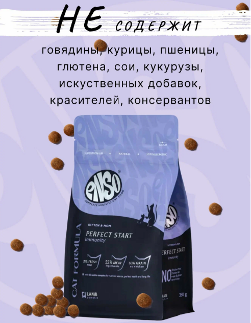 ENSO Cat formula Perfect start – сухой полнорационный корм для котят от 1 месяца, беременных и кормящих кошек со свежим ягненком с добавлением тыквы.