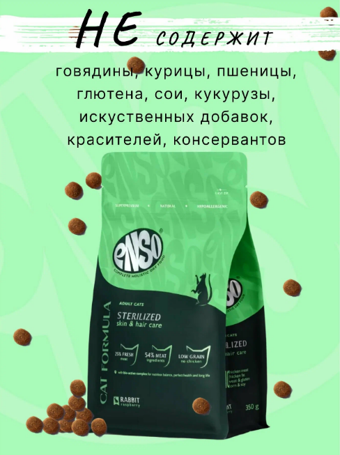 ENSO® Cat Formula – гипоаллергенная линия сухих кормов класса суперпремиум холистик для ежедневного поддержания здоровья кошек с высоким содержанием свежего мяса (25%) без курицы и куриного жира, сои, пшеничного глютена и ГМО.