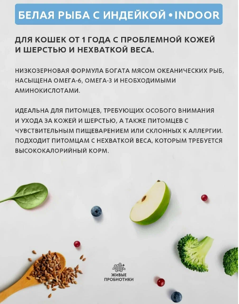 Для взрослых кошек с нормальной активностью, чувствительной кожей и шерстью или склонных к аллергии. Формула богата мясом океанических рыб, насыщена Омега-6, Омега-3 и необходимыми аминокислотами. Идеальна для питомцев, требующих особого внимания и ухода за кожей и шерстью, а также питомцев с чувствительным пищеварением или склонных к аллергии. -70% мяса в составе-Низкозерновой состав-Два источника животного белка-Гипоаллергенные ингредиенты-33% белки, 16% жиры Не содержит: пшеницу, кукурузу, свеклу, горох, субпродукты, яйца, курицу, куриный жир, соль, сахар, красители, ароматизаторы, сою и ГМО. Низкозерновой состав и натуральные гипоаллергенные ингредиенты в сочетании с диетическим мясом белой рыбы, помогают предотвратить аллергические реакции и пищевую непереносимость, обеспечивая иммунное и пищеварительное здоровье. Деликатный способ приготовления сохраняет все полезные свойства и питательные вещества натуральных ингредиентов и обеспечивают отличное физическое состояние и долгую здоровую жизнь питомца.