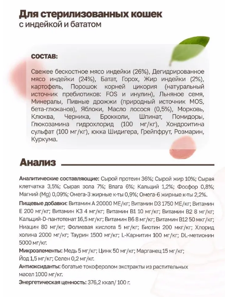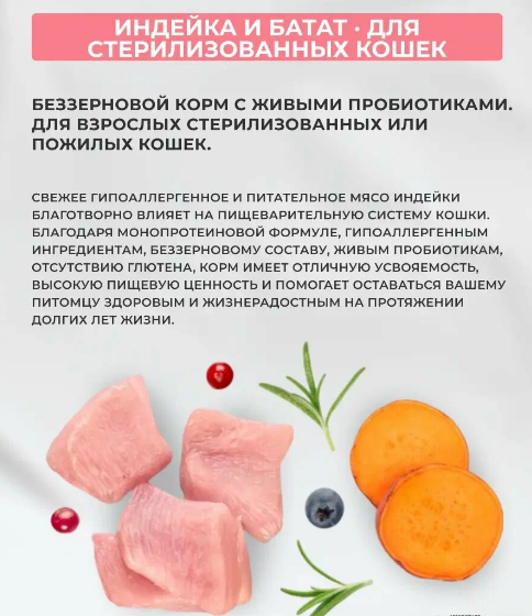 Свежее гипоаллергенное и питательное мясо индейки благотворно влияет на пищеварительную систему кошки. Благодаря монопротеиновой формуле, гипоаллергенным ингредиентам, беззерновому составу, живым пробиотикам, отсутствию глютена, корм имеет отличную усвояемость, высокую пищевую ценность и помогает оставаться вашему питомцу здоровым и жизнерадостным на протяжении долгих лет жизни.