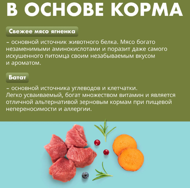 Батат - основной источника углеводов и клетчатки. Легко усваиваемый, богат множеством витамин и является отличной альтернативой зерновым кормам при пищевой непереносимости и аллергии.