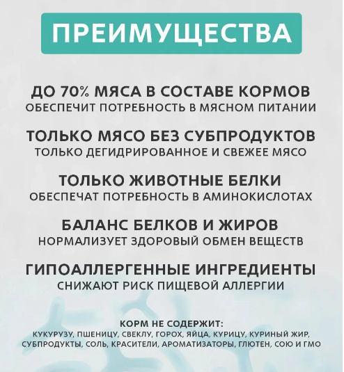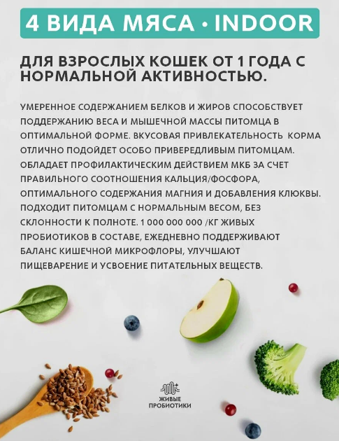 Для взрослых кошек с нормальной активностью, чувствительным пищеварением или склонных к аллергии. Умеренное содержание белков и жиров способствует поддержанию веса и мышечной массы питомца в оптимальной форме. Миллиард живых пробиотиков ежедневно поддерживают микрофлору кишечника, улучшают пищеварение, усвоение питательных веществ и предотвращают аллергию. - 70% мяса в составе- 4 вида диетического мяса- Живые пробиотики- Низкозерновой состав- Гипоаллергенные ингредиенты- 32% белки, 14% жиры Не содержит: кукурузу, пшеницу, свеклу, горох, субпродукты, яйца, курицу, куриный жир, соль, сахар, красители, ароматизаторы, сою и ГМО. Тщательно отобранные, натуральные гипоаллергенные ингредиенты, помогают предотвратить аллергические реакции и пищевую непереносимость, обеспечивая иммунное и пищеварительное здоровье. Деликатный способ приготовления сохраняет все полезные свойства и питательные вещества натуральных ингредиентов и обеспечивают отличное физическое состояние и долгую здоровую жизнь питомца.