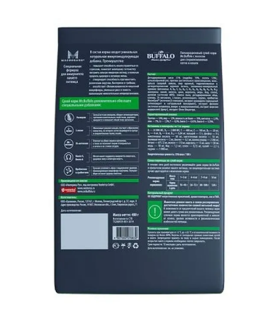 Полнорационный сухой корм Mr. Buffalo с лососем для взрослых стерилизованных кошек и кастрированных котов. Разработан с учётом потребностей стерилизованных кошек и кастрированных котов, включает все необходимые питательные вещества для поддержания жизненных сил и здоровья питомца. Благодаря умеренному содержанию жиров корм помогает снизить риск возникновения избыточного веса при соблюдении норм кормления.