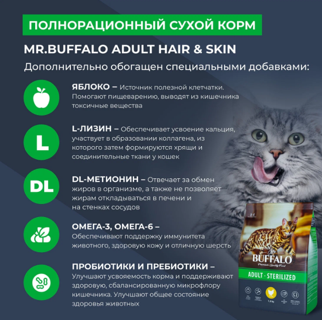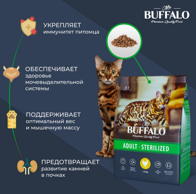 Полнорационный сухой корм Mr.Buffalo STERILIZED разработан с учётом потребностей стерилизованных кошек и кастрированных котов, включает все необходимые питательные вещества для поддержания жизненных сил, здоровья мочевыделительной системы, поддержания оптимального веса и мышечной массы питомца.