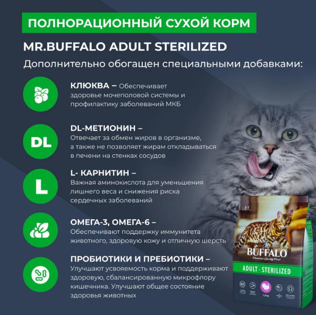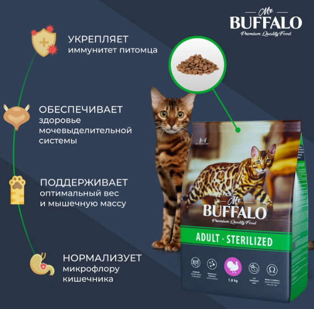 Сухой корм Mr. Buffalo Sterilized индейка для стерилизованных кошек (1,8 кг) - это полнорационный корм суперпремиум класса, разработанный с учетом потребностей стерилизованных кошек и кастрированных котов. Он включает все необходимые питательные вещества для поддержания жизненных сил, здоровья мочевыделительной системы, оптимального веса и мышечной массы питомца.