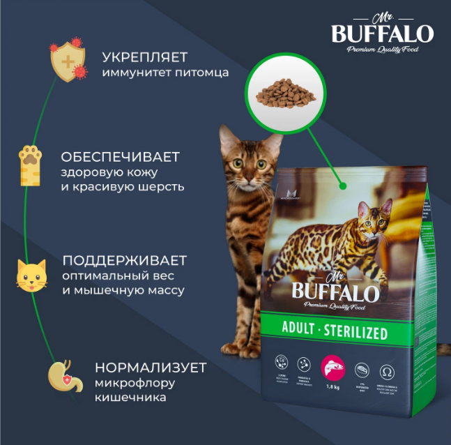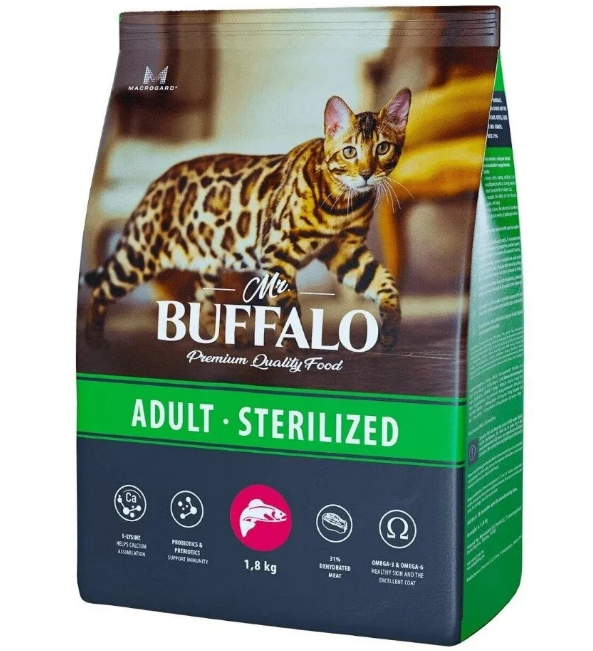 Полнорационный сухой корм Mr. Buffalo разработан с учётом потребностей кастрированных котов и стерилизованных кошек, включает все необходимые питательные вещества для поддержания жизненных сил, здоровья мочевыделительной системы, поддержания оптимального веса и мышечной массы Вашего питомца