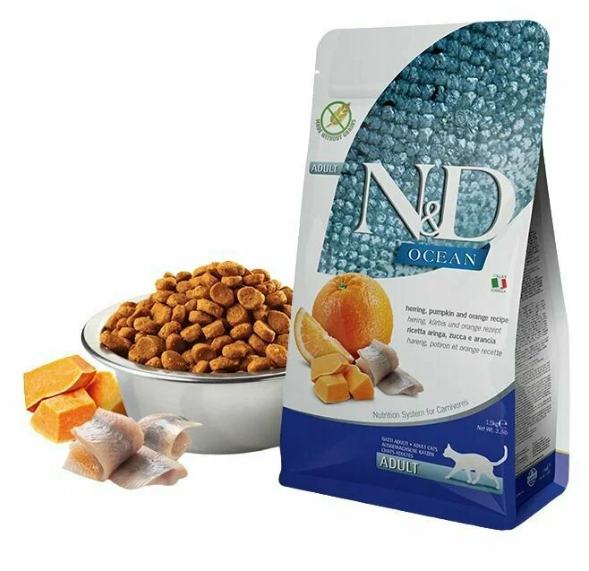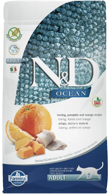 Farmina N&D Ocean Herring, Pumpkin & Orange — это беззерновой суперпремиум корм для взрослых кошек, созданный с акцентом на морские белки и натуральные ингредиенты. Формула содержит полезную сельдь, тыкву и апельсин, которые обеспечивают оптимальное питание, поддержку иммунитета и здоровое пищеварение.