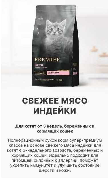 Полнорационный сухой корм супер-премиум класса на основе свежего мяса индейки для котят с 3-недельного возраста, беременных и кормящих кошек. Идеально подходит для питомцев, склонных к аллергии, поможет укрепить иммунитет и улучшить состояние шерсти и кожи.