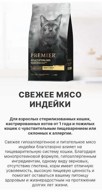 Свежее гипоаллергенное и питательное мясо индейки благотворно влияет на пищеварительную систему кошки. Благодаря монопротеиновой формуле, гипоаллергенным ингредиентам, одному виду зерновых, отсутствию глютена, корм имеет отличную усвояемость, высокую пищевую ценность и помогает оставаться вашему питомцу здоровым и жизнерадостным на протяжении долгих лет жизни.