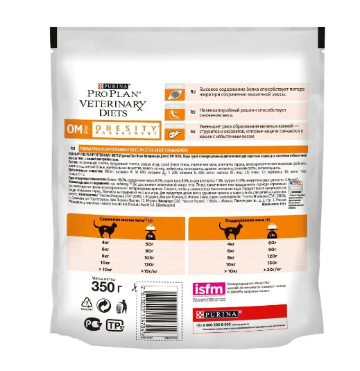 Pro Plan Veterinary Diets OM Корм сухой полнорационный диетический для взрослых кошек при ожирении. Корм рекомендуется для снижения избыточной массы тела, имеет низкокалорийную рецептуру.