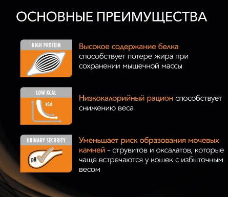 Высокое содержание белка способствует потере жира при сохранении мышечной массы. Низкокалорийный рацион способствует снижению веса. Уменьшает риск образования мочевых камней - струвитов и оксалатов, которые чаще встречаются у кошек с избыточным весом.