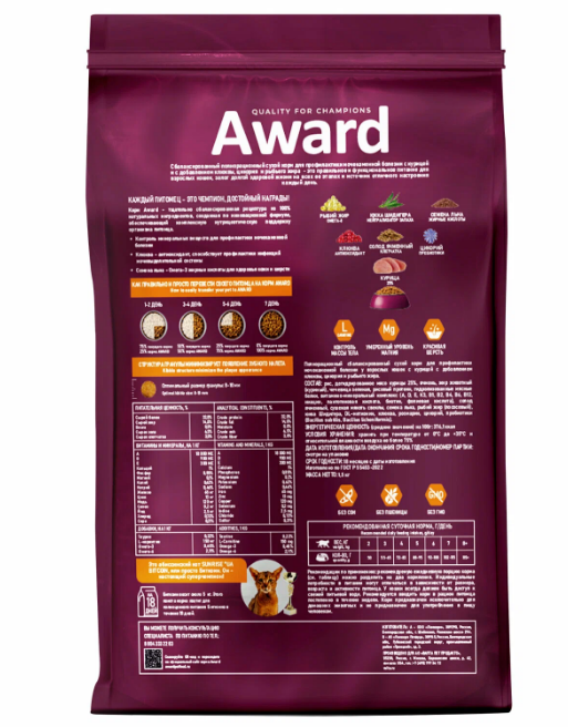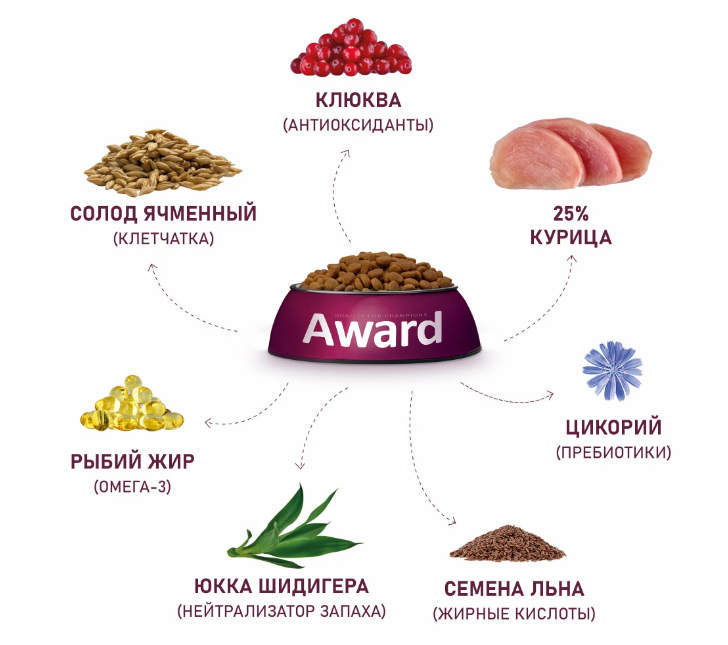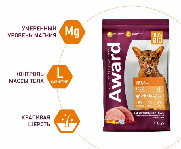 Корм Авард - полнорационный сбалансированный корм для взрослых кошек, помогающий снизить риск рецидива образования кристаллов и камней струвитного типа в мочевом пузыре.