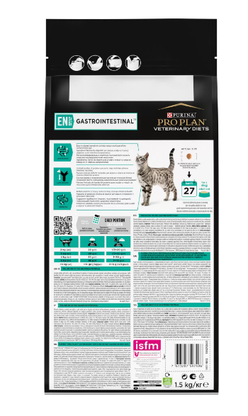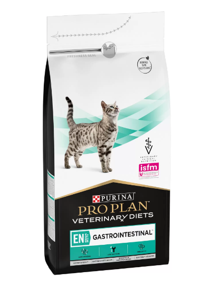 Корм сухой полнорационный диетический PRO PLAN® Veterinary Diets EN St/Ox Gastrointestinal (Гастроинтестинал) для взрослых кошек и котят для снижения проявлений кишечных расстройств, способствует восполнению питательных веществ и выздоровлению. Легкоусвояемый, с повышенным содержанием натрия и калия, высококалорийный, с высоким содержанием важнейших питательных веществ. Использование данного корма рекомендовано под наблюдением ветеринарного врача. Преимущества: 1. Легко перевариваемые компоненты помогают снизить нагрузку на раздраженный кишечник; 2. Состав корма с ограниченным числом источников белка позволяет свести к минимуму нежелательные кишечные реакции; 3. Содержит пребиотик (инулин, получаемый из цикория), помогающий укреплять здоровье кишечника. Рекомендации по приготовлению/использованию: Рекомендации по кормлению: см. таблицу. Продолжительность кормления при кишечных рсстройствах - до 12 недель до момента восполнения питательных веществ и выздоровления. Для улучшения пищеварения разделите суточную норму на несколько небольших приемов. Перед применением или продлением периода кормления сверх рекомендованного проконсультруйтесь с ветеринарным врачом.