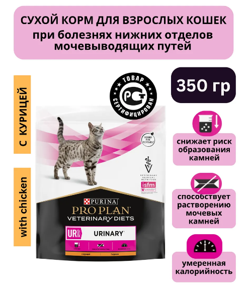 Pro Plan Urinary для кошек, 350 г — это сбалансированный уринарный сухой корм премиум-класса, созданный для поддержания здоровья мочевыделительной системы и профилактики мочекаменной болезни (МКБ) у домашних кошек. Специально разработанная формула с пониженным содержанием магния помогает контролировать уровень pH мочи, снижая риск образования струвитов и оксалатов.