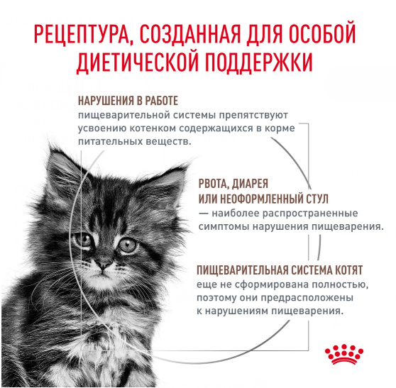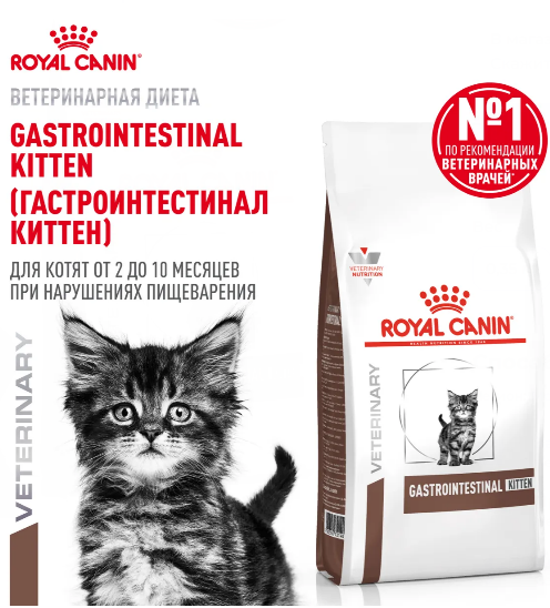 Сухой корм ROYAL CANIN GASTROINTESTINAL KITTEN – полнорационный диетический корм для котят, рекомендуемый при острых расстройствах пищеварения, в реабилитационный период и при истощении. Легкоусвояемые ингредиенты. Дополнительное количество электролитов и высокое содержание основных питательных веществ. Высокая калорийность .Рекомендуется для котят с момента отъема до достижения взрослого возраста (а также для кошек в период беременности/лактации)